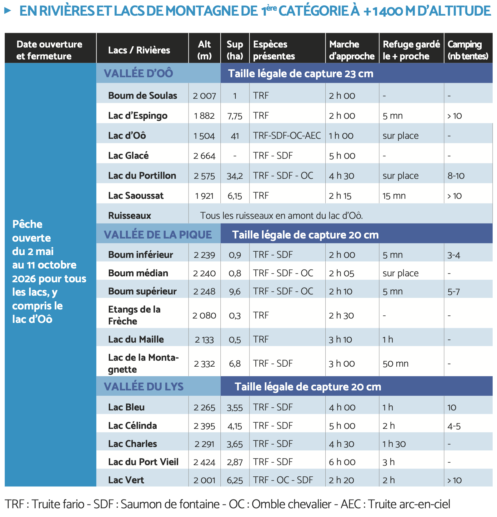La pêche à la ligne est autorisée dans le département de la Haute-Garonne pour toutes les espèces de poissons sauf le saumon, l’alose, l’ombre commun, la truite de mer, la civelle, l’esturgeon, la lamproie marine, la lamproie fluviatile et l’anguille d’avalaison, pendant les périodes d’ouverture qui suivent, sauf en lac de montagne (voir le tableau des lacs de montagne et les périodes d'ouverture indiquées).