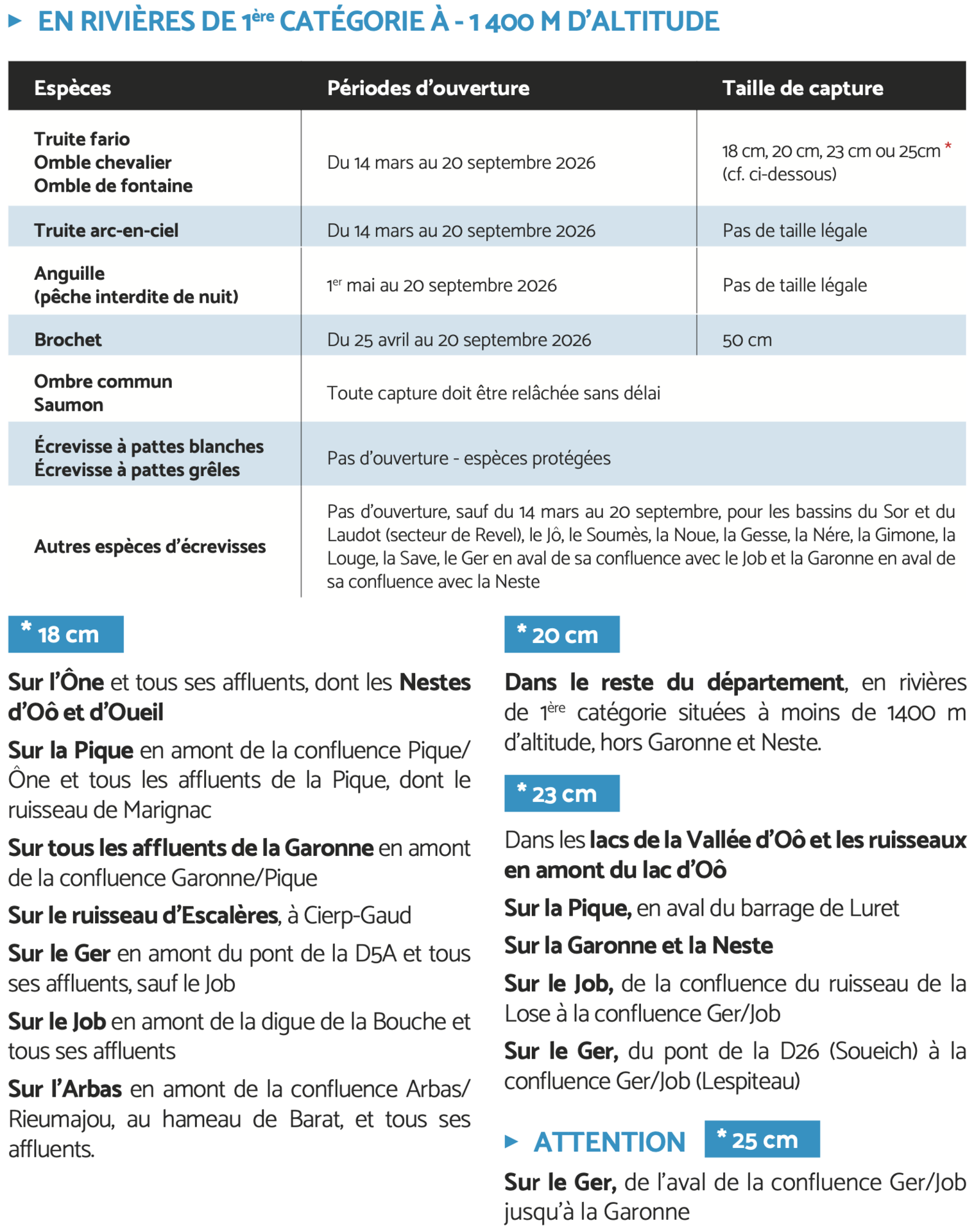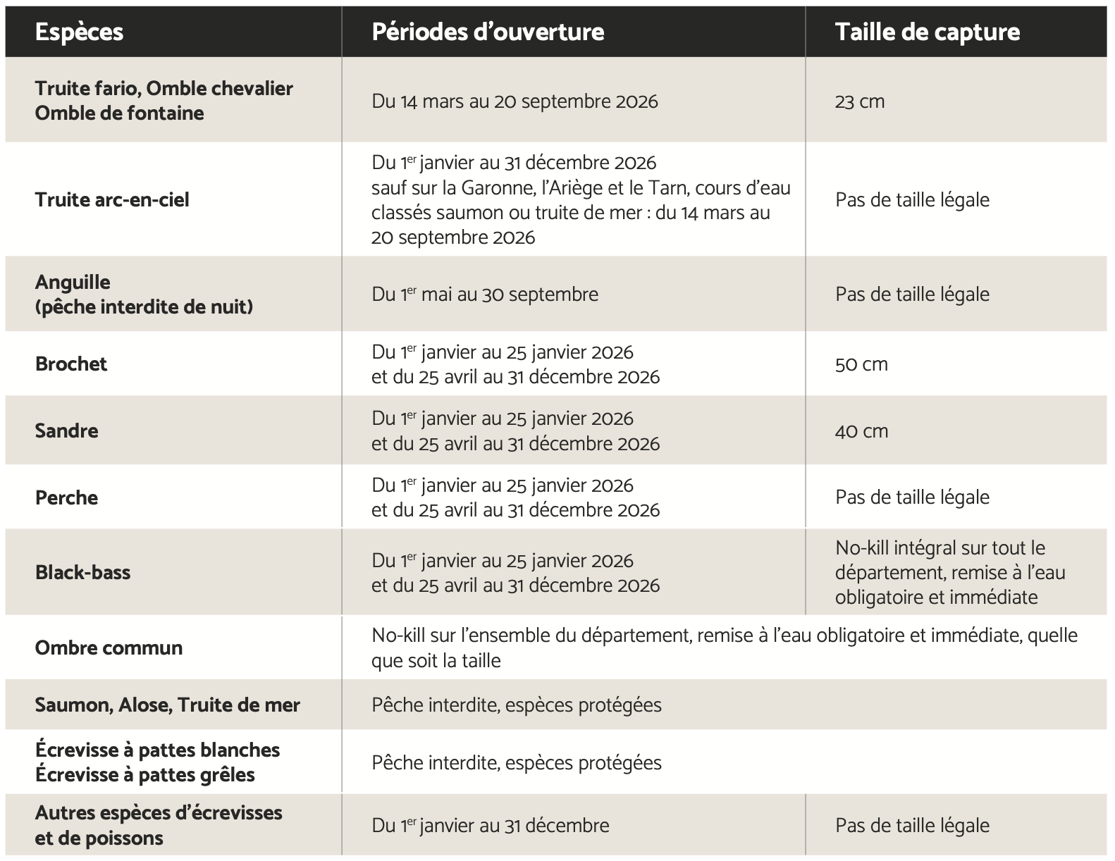 La pêche à la ligne est autorisée dans le département de la Haute-Garonne pour toutes les espèces de poissons sauf le saumon, l’alose, l’ombre commun, la truite de mer, la civelle, l’esturgeon, la lamproie marine, la lamproie fluviatile et l’anguille d’avalaison, du 1er janvier au 31 décembre, à l'exception des espèces qui suivent."