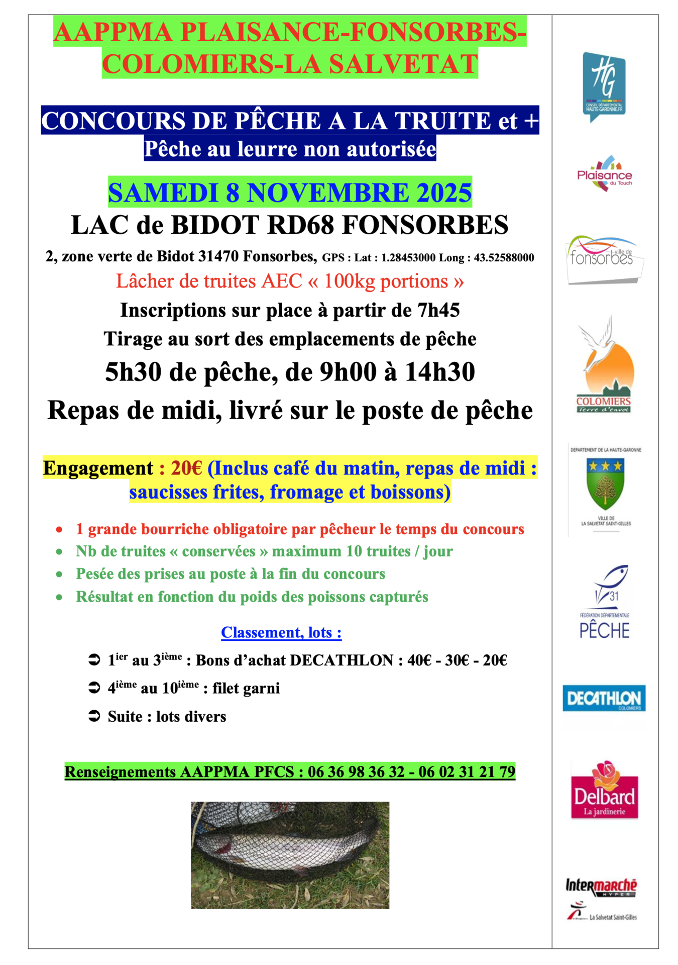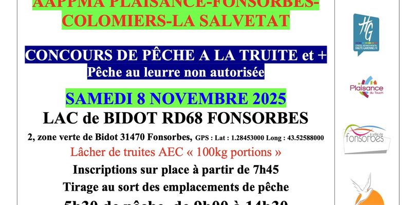 L'AAPPMA Plaisance-Fonsorbes-Colomiers-La Salvetat organise un concours de pêche de la truite, le samedi 8 novembre 2025, au lac de Bidot, à Fonsorbes.