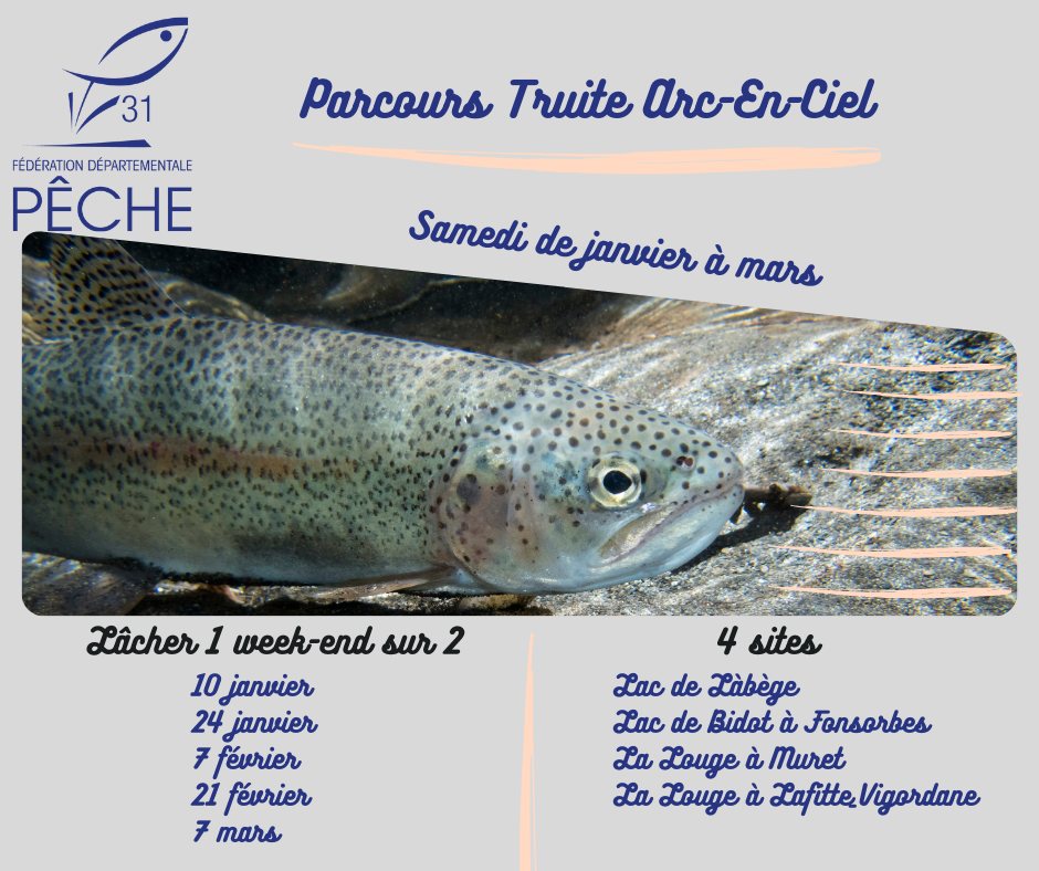 Les 4 parcours truite arc-en-ciel ont repris du service ; ils seront empoissonnés à 6 reprises en 2026, une semaine sur deux, soit les semaines : 2, 4, 6, 8 et 10.