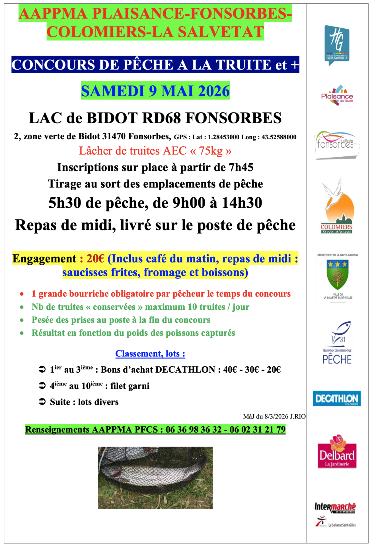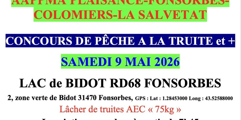 L'AAPPMA Plaisance-Fonsorbes-Colomiers-La Salvetat organise un concours de pêche de la truite, le samedi 9 mai 2026, au lac de Bidot, à Fonsorbes.